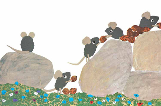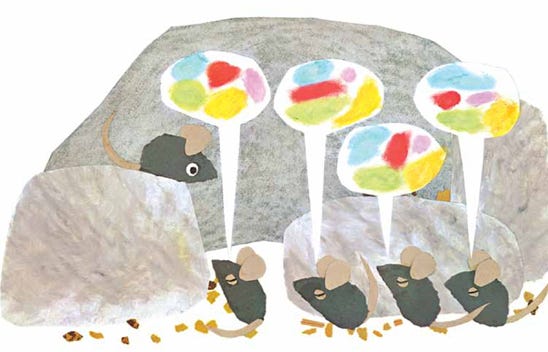 When winter does come and the mice run out of food, they feel the cold and grow silent. And then they remember Frederick’s supplies. He tells them about the sun rays and they feel warm. He tells them about the colors and then recites a poem that lifts their spirits. This little color-gathering field mouse poet is the best example of what it means to be an artist that I know of.